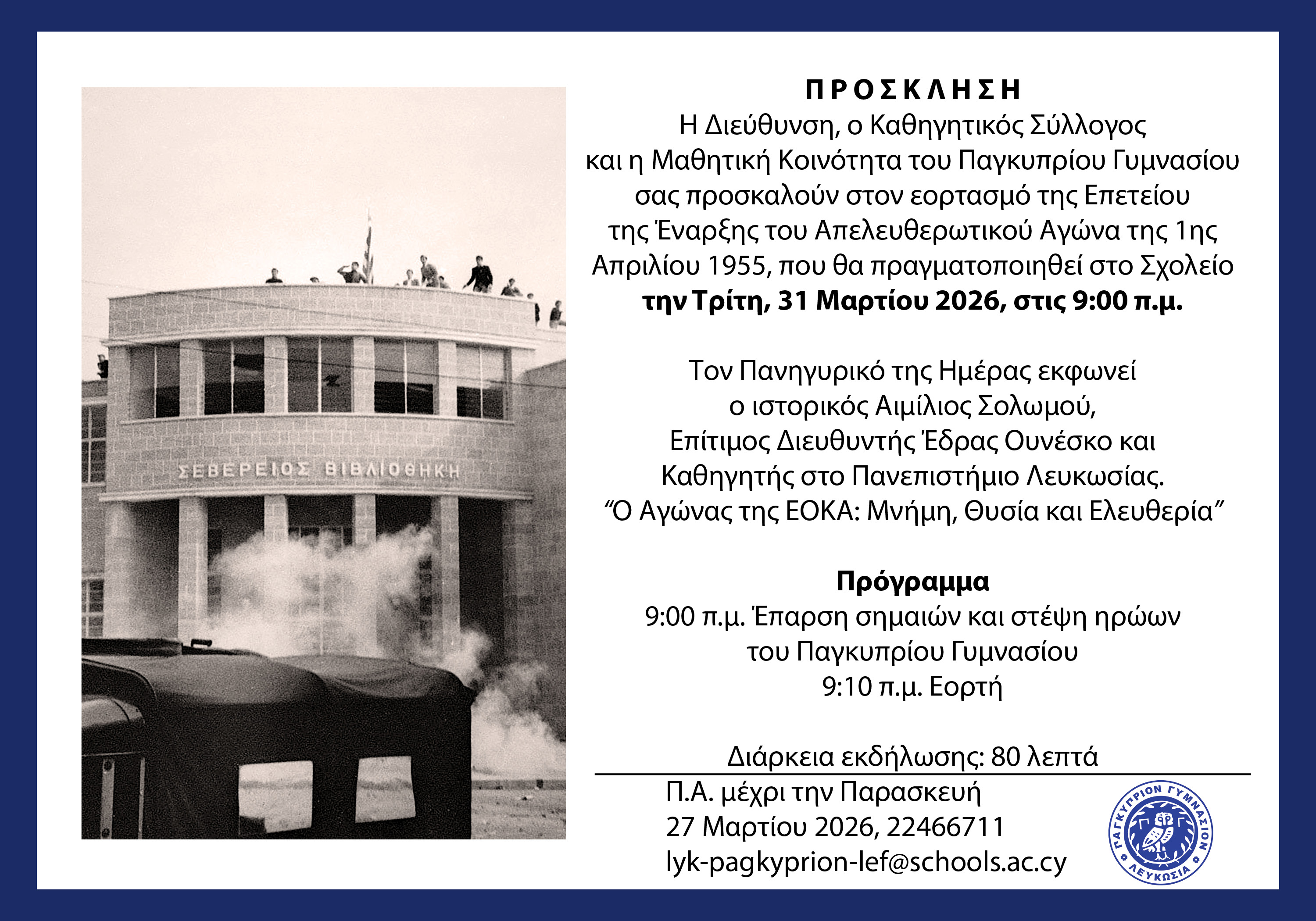 Σας καλωσορίζω στο Παγκύπριον Γυμνάσιον, το πρώτο σχολείο Μέσης Εκπαίδευσης της Κύπρου. Ιδρύθηκε στα δύσκολα χρόνια της Τουρκοκρατίας, το 1812, από τον Αρχιεπίσκοπο Κυπριανό και υπήρξε από την πρώτη στιγμή φυτώριο παιδείας και κέντρο ελληνικών γραμμάτων. Στον κατάλογο των καθηγητών και των αποφοίτων του περιλαμβάνονται, εκτός από τους πεσόντες στους αγώνες του Ελληνισμού, προσωπικότητες που σημάδεψαν την πολιτική, πολιτιστική, πνευματική και επιστημονική ζωή της Κύπρου.