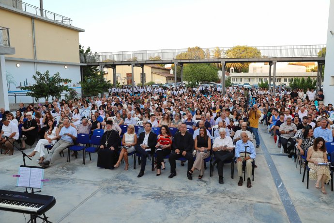 Η τελετή ξεκίνησε με την είσοδο των τελειοφοίτων υπό τους ήχους της Φιλαρμονικής του Σχολείου μας. Ακολούθησε Δέηση και η αποτίμηση του σχολικού έργου από τη Διευθύντρια του Σχολείου. Συγκινητική ήταν η στιγμή της προσφώνησης των τελειοφοίτων από τη Διευθύντρια καθώς και της αντιφώνησης από την πρωτεύσασα μαθήτρια, Ευρυδίκη Χριστοφίδη του τμήματος ΣΤ32.