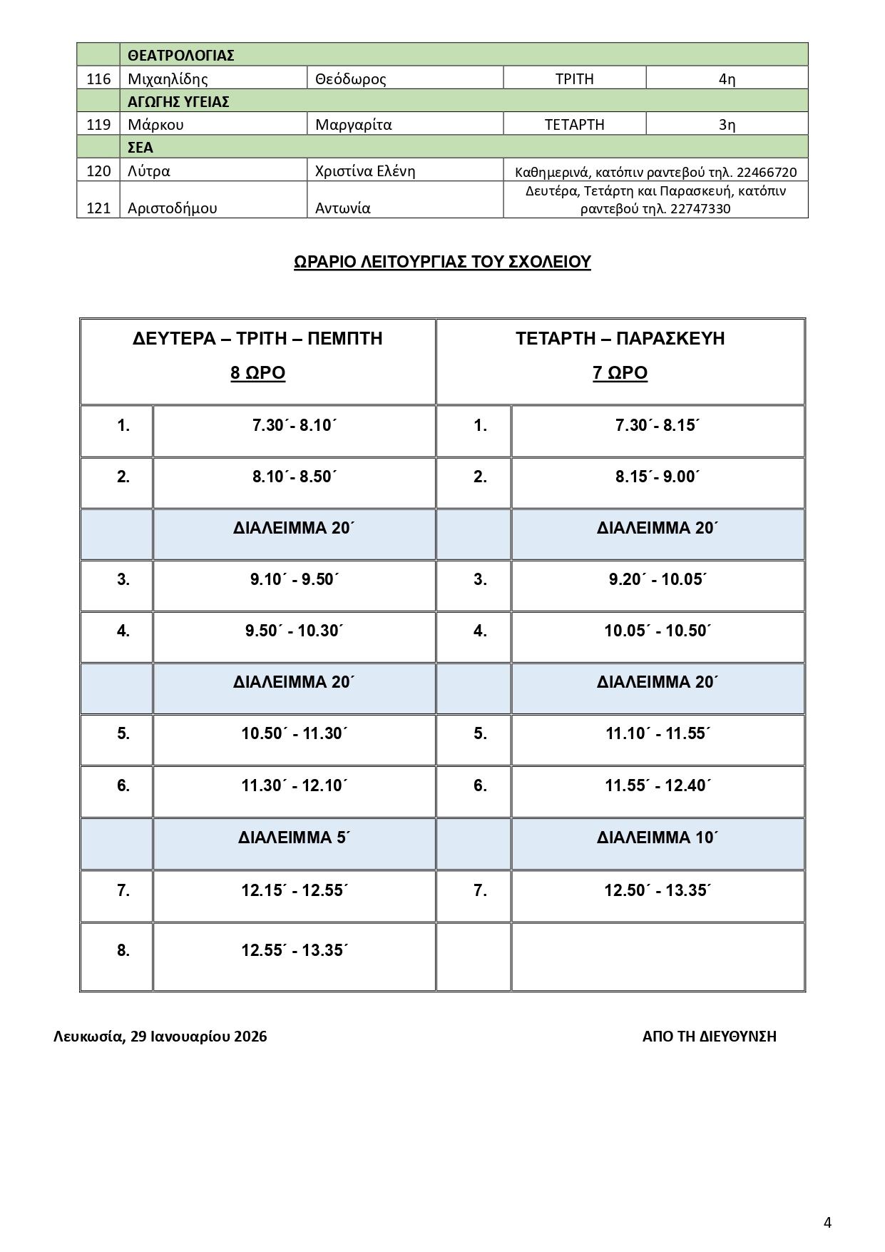 Ωράριο λειτουργίας του σχολείου