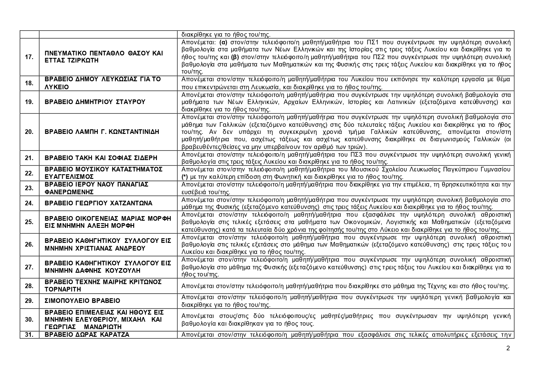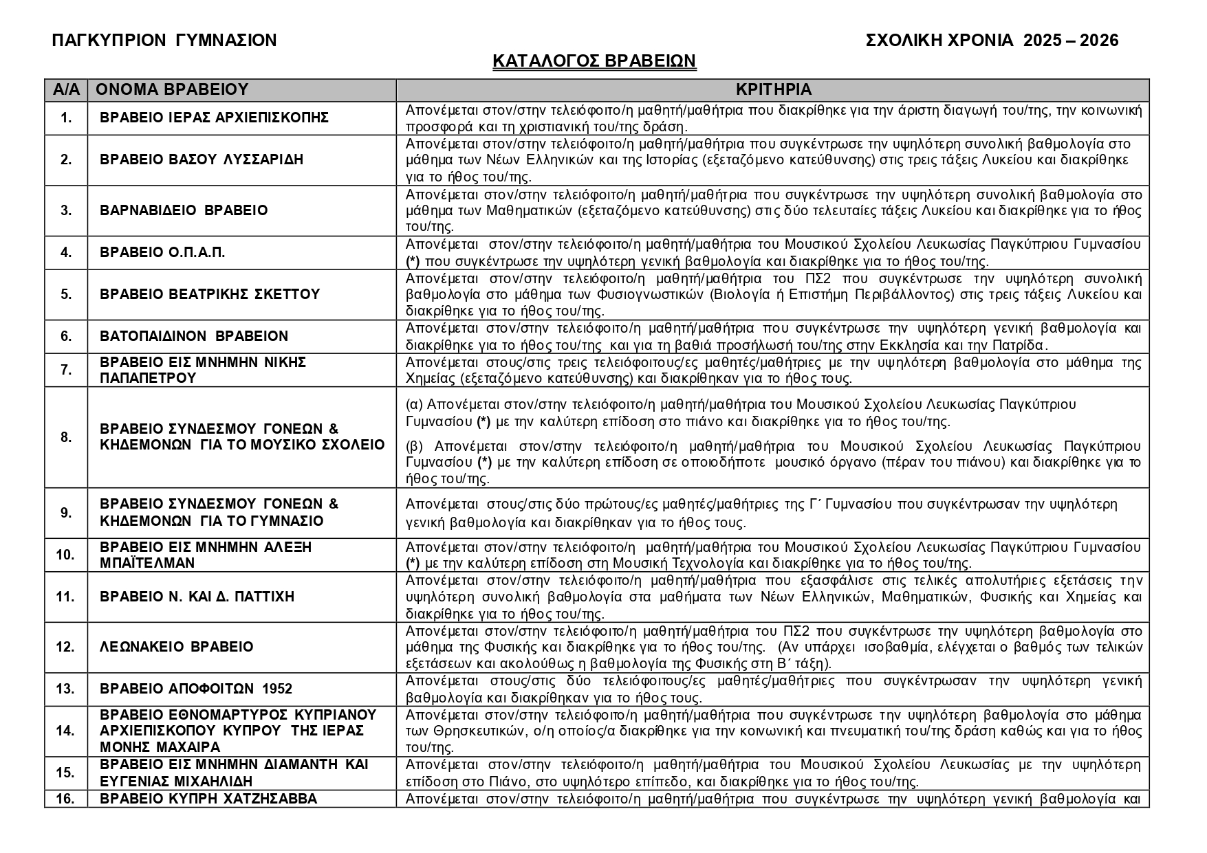 Κατάλογος βραβείων 2025-2026
