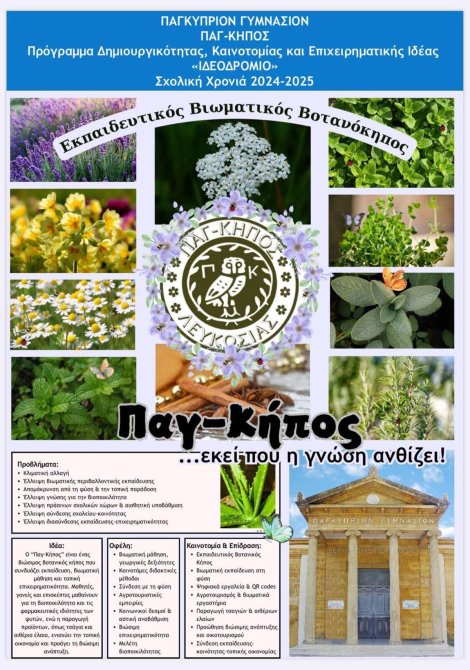 Η βραβευμένη επιχειρηματική ιδέα, με τίτλο «ΠΑΓ-ΚΗΠΟΣ: Βιώσιμος Εκπαιδευτικός Βοτανόκηπος», αποτελεί μια καινοτόμο πρόταση που στοχεύει στη δημιουργία ενός ζωντανού εργαστηρίου γνώσης στον σχολικό μας χώρο. Μέσω του «ΠΑΓ-ΚΗΠΟΣ», μαθητές, εκπαιδευτικοί, γονείς, επισκέπτες και τοπική κοινότητα θα έχουν την ευκαιρία να γνωρίσουν βιωματικά τον μαγικό κόσμο των αρωματικών και φαρμακευτικών φυτών, τη σημασία της βιοποικιλότητας, καθώς και τις δυνατότητες της βιώσιμης επιχειρηματικότητας.