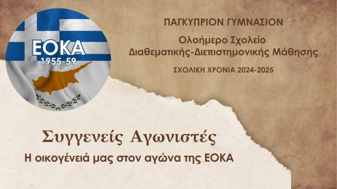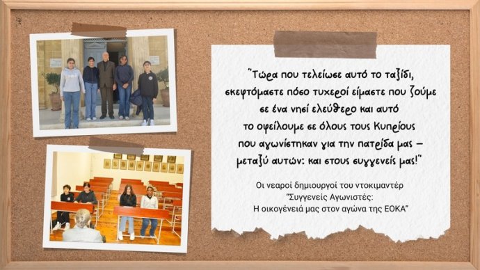 Στο πλαίσιο των δράσεων του Σχολείου μας για απόδοση τιμής στην ιστορική μέρα κατά την οποία είχε ξεκινήσει ο απελευθερωτικός αγώνας του 1955-1959, δημοσιεύουμε σήμερα ακόμα ένα ντοκιμαντέρ που δημιουργήθηκε στην Κατεύθυνση «Ελληνική Γλώσσα και Πολιτισμός» του Ολοήμερου Σχολείου Διαθεματικής και Διεπιστημονικής Μάθησης. Στο ντοκιμαντέρ οι νεαροί δημιουργοί παρουσιάζουν τον τρόπο με τον οποίο έδρασαν οι συγγενείς τους που συμμετείχαν τότε ως μαθητές στον απελευθερωτικό αγώνα της Ε.Ο.Κ.Α. το 1955-1959.