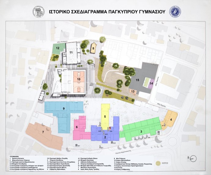 Στο πλαίσιο των δράσεων που εκπονήθηκαν κατά τη σχολική χρονιά 2024-2025 στην Κατεύθυνση «Ελληνική Γλώσσα και Πολιτισμός» του Ολοήμερου Σχολείου Διαθεματικής-Διεπιστημονικής Μάθησης του Παγκυπρίου Γυμνασίου, ομάδα μαθητών/τριών του τμήματος Α03 εκπόνησε δράσεις για την ανάδειξη της ιστορίας του Παγκυπρίου Γυμνασίου. Μία από αυτές ήταν η δημιουργία του ιστορικού σχεδιαγράμματος του Παγκυπρίου Γυμνασίου, στο οποίο υποδεικνύονται με διαφορετικό χρώμα και αρίθμηση οι διάφορες οικοδομικές φάσεις του Σχολείου, και άλλα σημεία ενδιαφέροντος που υπάρχουν σε αυτό (Κρύπτη, Σεβέρειος Βιβλιοθήκη, ειδικές αίθουσες, μνημεία, επιγραφές κ.ά.). Το σχεδιάγραμμα εμπλουτίζεται με σύντομα κατατοπιστικά σημειώματα.