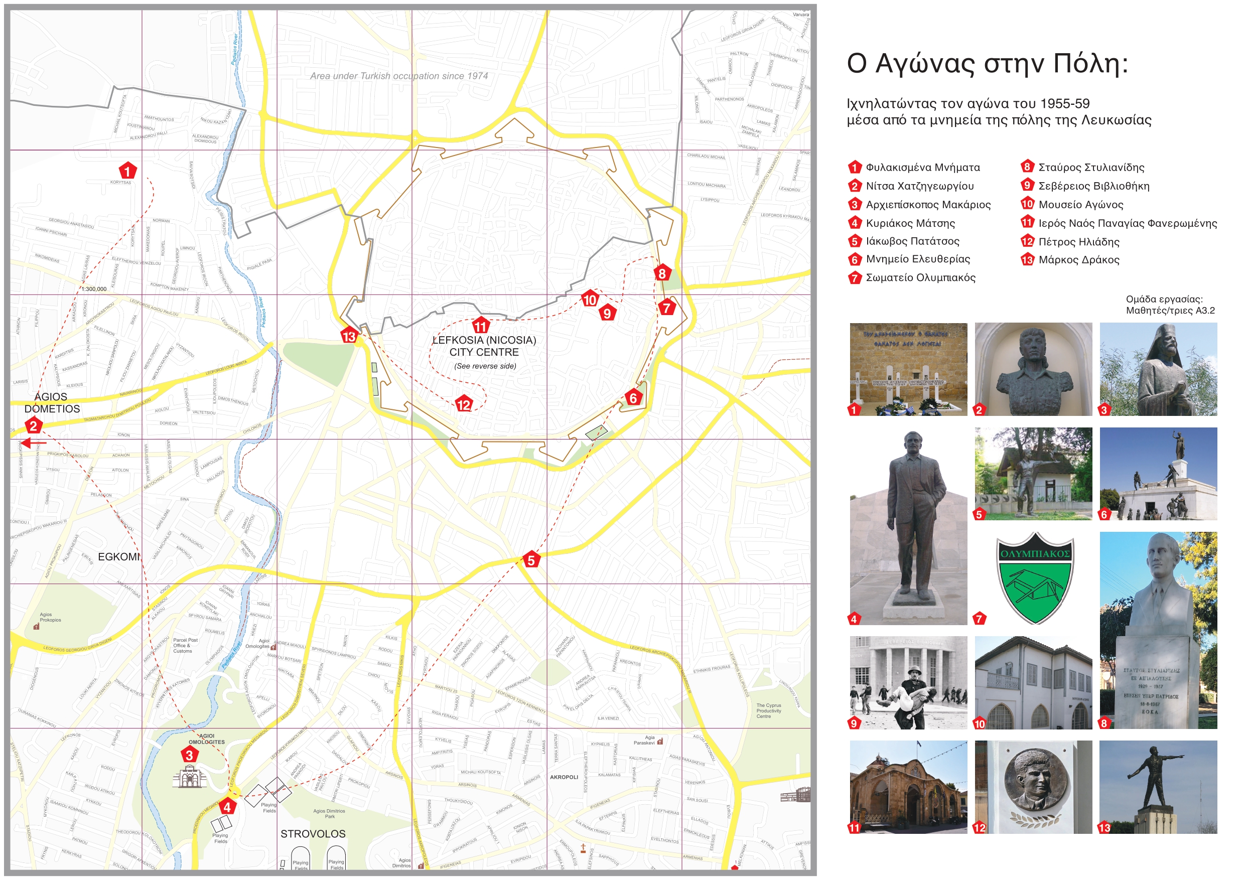 Στο πλαίσιο των δράσεων που εκπονήθηκαν κατά το πρώτο τετράμηνο της σχολικής χρονιάς 2024-2025 στο Πρόγραμμα Ελληνικής Γλώσσας και Πολιτισμού του Ολοήμερου Διαθεματικού Διεπιστημονικού Προγράμματος Μάθησης και με αφορμή τα 70 χρόνια από τον εθνικοαπελευθερωτικό αγώνα του 1955-1959 οι μαθητές/τριες ασχολήθηκαν με τα μνημεία στην πόλη της Λευκωσίας που συνδέονται με τον Αγώνα. Από τη βιβλιογραφική και διαδικτυακή έρευνα αλλά και την έρευνα πεδίου εντoπίστηκαν τα ακόλουθα 13 μνημεία: