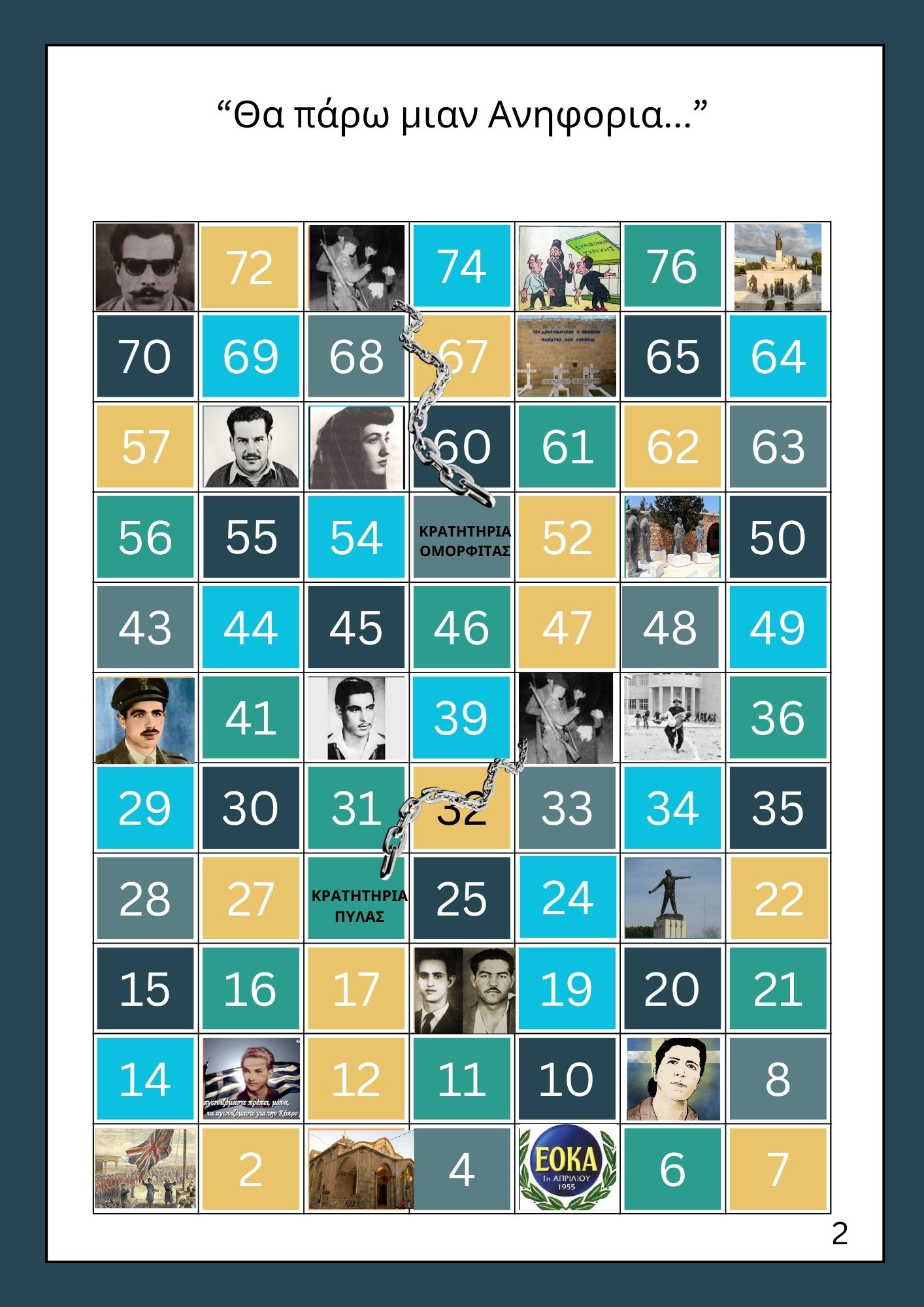 Παιγνίδι γνώσεων για τον Εθνικοαπελευθερωτικό αγώνα της ΕΟΚΑ 1955-59 το οποίο παίζεται από δύο ή και περισσότερα άτομα με τη χρήση ζαριού. Στόχος του παιχνιδιού είναι να τερματίσει κάποιος πρώτος. Οι παίκτες θα πρέπει να απαντούν σε ερωτήσεις που συνδέονται με το αγώνα της ΕΟΚΑ και που αντιστοιχούν σε κάθε ένα από τα είκοσι εικονίδια.